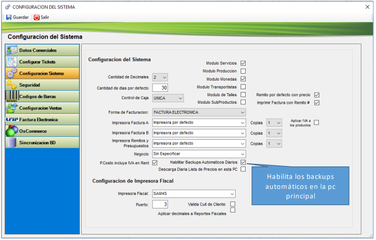 Desde la solapa de “Configuración de Sistema” deberá habilitar la opción de Backus Automáticos Diarios y presionar el botón “Guardar”.