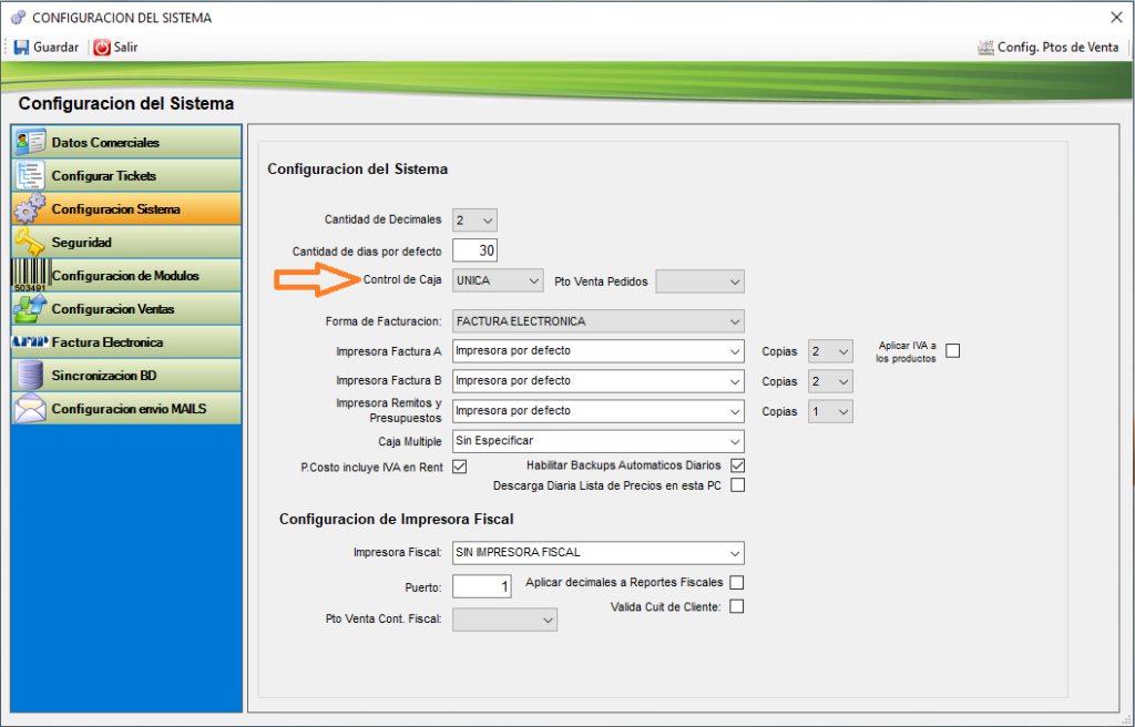 6- El ultimo paso es configurar cada PC y asignarle la caja en la cual va a trabajar, para realizar esta accion debera ir al menu Configuraciones luego seleccionar la opcion Configuracion del Sistema y en la solapa Configuracion del Sistema ir a la opcion Caja Multiple