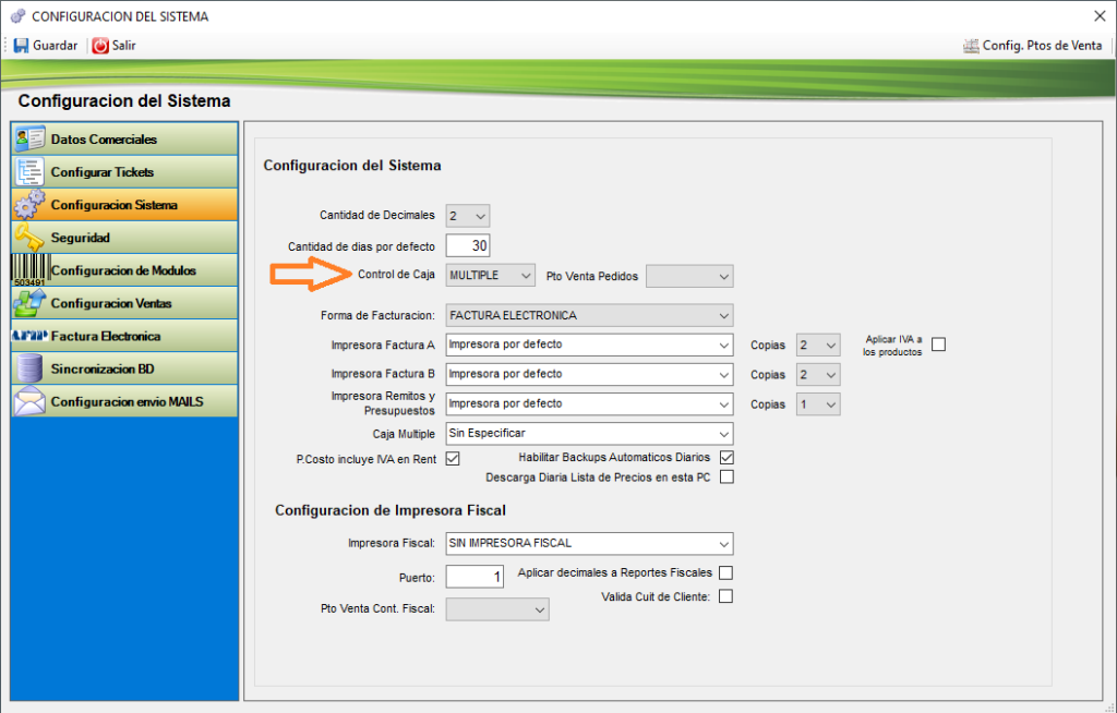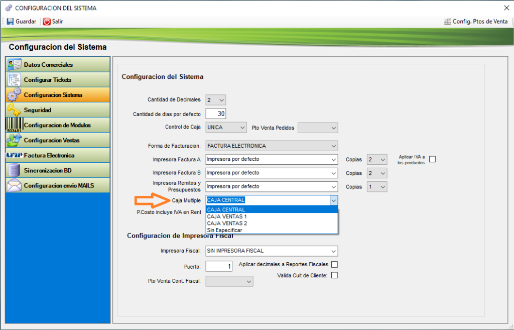 6- El ultimo paso es configurar cada PC y asignarle la caja en la cual va a trabajar, para realizar esta accion debera ir al menu Configuraciones luego seleccionar la opcion Configuracion del Sistema y en la solapa Configuracion del Sistema ir a la opcion Caja Multiple