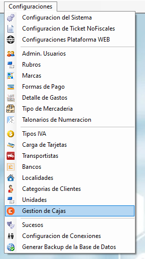 4- Ir al menu Configuraciones y seleccionar la opcion Gestion de Cajas