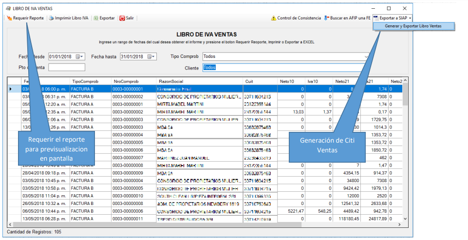 Al ingresar a la pantalla del Libro de IVA ventas, deberá ingresar los filtros correspondientes al mes que desea generar, es importante ingresar las fechas correctas, de modo contrario podrá perder información en el archivo citi. Una vez ingresada las fechas, presione el botón Requerir para visualizar los registros en pantalla. A continuación podrá presionar el botón Exportar a SIAP como muestra la siguiente imagen.
