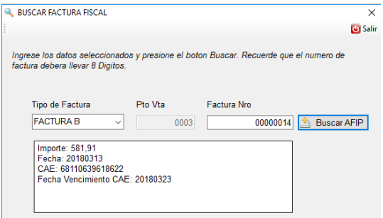 También dispondrá de una función para buscar una Factura Electrónica en AFIP, ante algún error podrá detectar la factura en el wsdl de AFIP, para ello presione el botón “Buscar en AFIP una FE”, el sistema abrirá una pantalla donde tendrá que ingresar los datos de la factura electrónica ya emitida.
