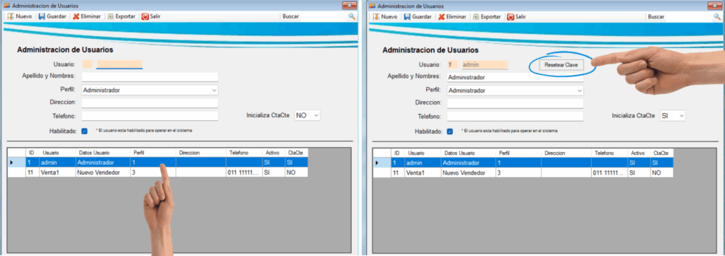 📁 Menú → 🧑💼 Usuarios → 🔁 Cambiar Clave