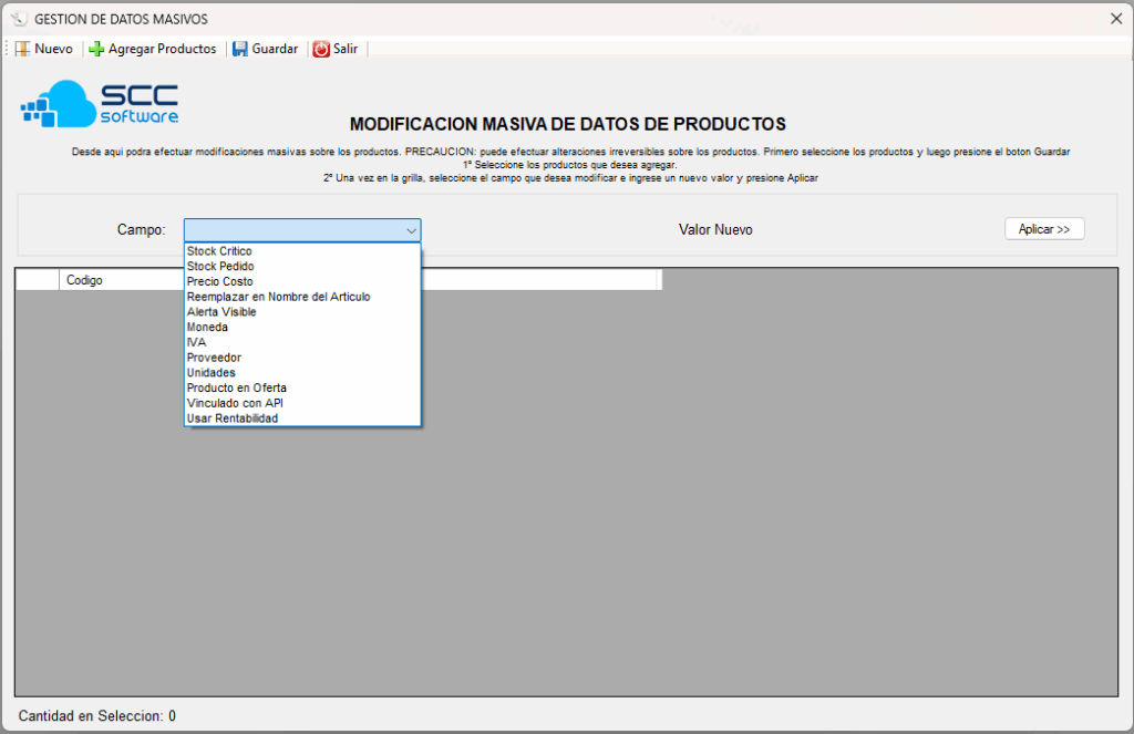 El sistema SCC Plataforma le permitira modificar valores de los productos de forma rapida y masivamente de algunos parametros generales. Para ello debera dirigirse al menu Mercaderias, opcion Modificacion de Produtos